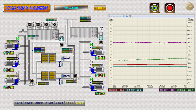 采用西门子S7-300 PLC控制系统和分布式IO控制站、WinCC上位机监控采集系统,充分运用优化的逻辑控制流程,并通过数字控制算法,调节各变频泵、变频冷水机组、电控调节阀,保证机组、水泵、冷却塔投用及切换充分合理优化,同时又能快速稳定地响应全部试验间、生产车间在全范围内的负荷切换和波动,保持环境空调冷水、工艺试验冷水、燃油冷水的工艺参数稳定。在保证生产试验工艺要求的基础上实现经济节能运行。